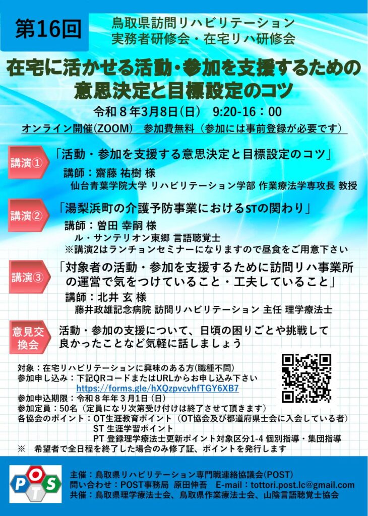 【研修会案内】第16回鳥取県訪問リハビリ実務者研修会・在宅リハ研修会のお知らせ
